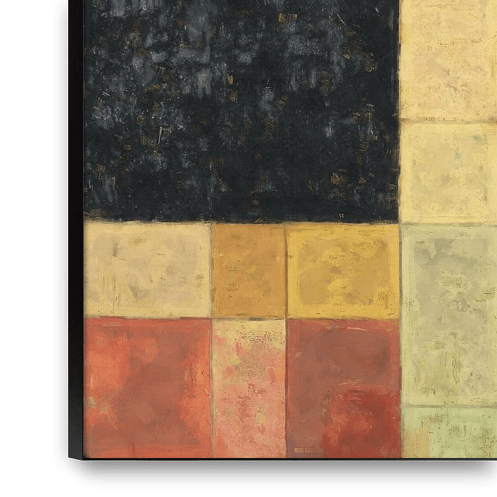 Dans cette œuvre, un personnage serein est assis tranquillement sur une plate-forme, regardant la lune qui plane majestueusement au-dessus de lui. Avec une palette qui mélange des tons subtils d'ocre, d'or et de terre, cette œuvre crée une atmosphère chaleureuse et intime. Le contraste entre les plans géométriques et le ciel sombre…