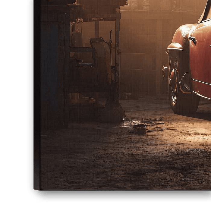 Dans un vieil atelier poussiéreux se trouve une Mercedes-Benz 190SL rouge classique, parfaitement mise en scène dans la lumière chaude d'un soleil bas. Les rayons du soleil passent à travers les grandes fenêtres sales et plongent la pièce dans une lueur dorée. Le contraste entre l'ambiance industrielle érodée par les intempéries et l'élégance immaculée de la voiture crée une atmosphère de révérence silencieuse.