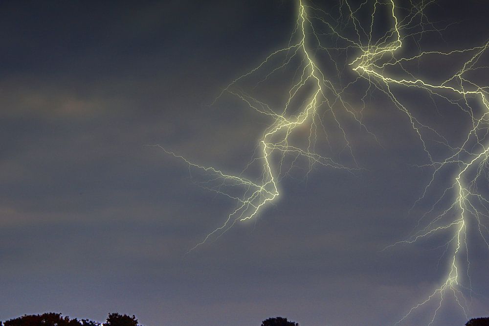 beau nuage au-dessus des arbres de la Böningstrasse à Gelsenkirchen-Resse avec des éclairs d'orage montés par ordinateur