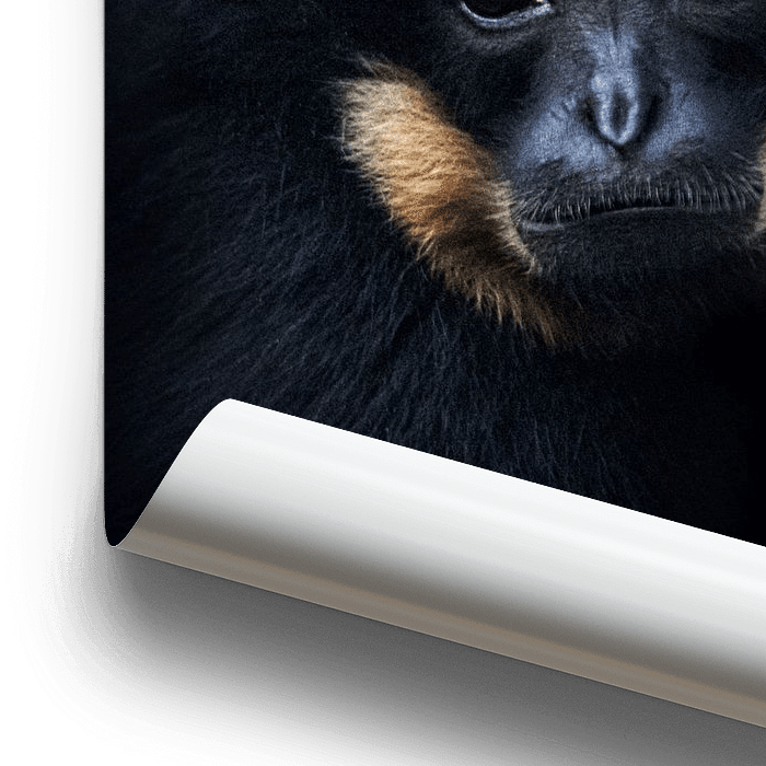 Photo sombre car le gibbon est noir. Les yeux et les joues jaunes sont mis en évidence.
