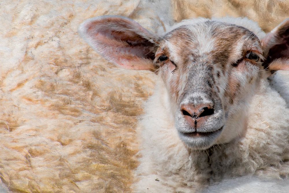 Grâce à un traitement technique, le mouton ressort et la laine s'estompe doucement pour créer une scène dans laquelle on aimerait se glisser par une morne journée d'automne.