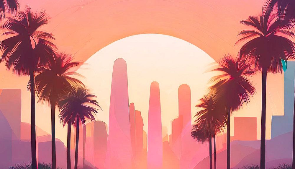 Achetez cette œuvre d'art de paysage LA Palmiers avec coucher de soleil par Mustafa Kurnaz sur toile, aluminium, ArtFrame ou photographie (encadrée), impression d'art en haute qualité et tout format.