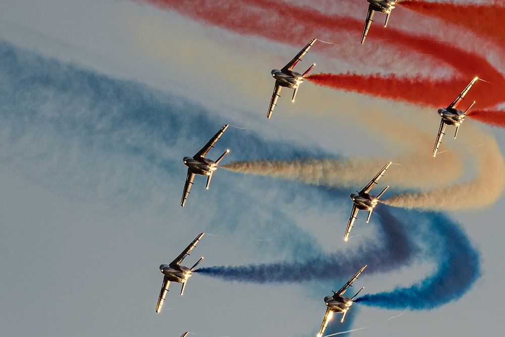Le spectacle magnifique et coloré de la Patrouille de France est réalisé avec un total de 8 avions d'entraînement Alpha Jet.