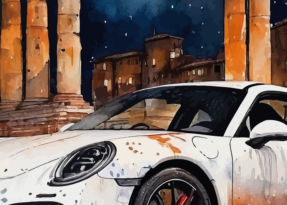 Une Porsche 911 Carrera 4 GTS blanche traverse de nuit le cœur de la Rome antique, sa couleur vive brillant sous l'ambre doux des réverbères historiques. Les arches du Colisée et les colonnes de marbre se reflètent sur sa carrosserie lisse, rendant la scène surréaliste. C'est une gracieuse fusion entre le passé et le présent - une performance moderne enveloppée dans l'âme d'une ville éternelle. Le Colosseum se promène de nuit au cœur de la Rome antique, sa couleur vive brillant sous l'ambre doux des réverbères historiques. Les arches du Colisée et les colonnes de marbre se reflètent sur sa carrosserie lisse, donnant à la scène un aspect surréaliste. C'est une gracieuse fusion du passé et du présent - une performance moderne enveloppée dans l'âme d'une ville éternelle.