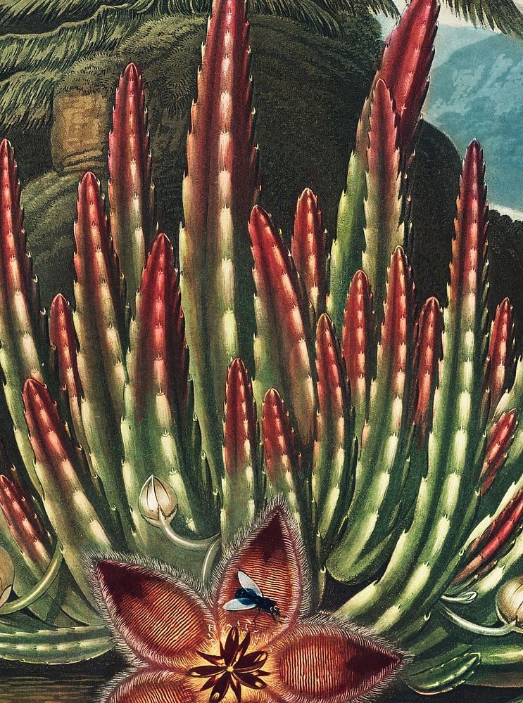 Le Temple de la flore, troisième et dernier volume de la Nouvelle illustration du système sexuel de Carolus von Linnaeus par Robert John Thornton, est probablement le plus luxueux et le plus célèbre de tous les grands livres floraux. Il contient trente et une planches réalisées à l'aide de diverses techniques, notamment l'aquatinte, la mezzo-tinte, le pointillé et la gravure au trait. Les impressions étaient imprimées en couleur et ensuite finies à la main. Au cours de la production, la plupart des plaques ont été modifiées ou ajoutées de temps à autre, produisant à chaque fois un "état" différent ; par conséquent, certaines plaques ont jusqu'à quatre états différents. Il s'agit d'un exemplaire de l'édition originale folio à l'échelle de l'éléphant (mesurant environ 56 x 44 cm), dont presque tous les exemplaires sont identiques. À l'origine, il était distribué aux abonnés sous forme de volumes qui pouvaient ensuite être reliés. En 1807, il est à nouveau publié sous forme de livre. En plus des planches, il comprend une série de pages de titre calligraphiées, des descriptions détaillées de chaque plante, y compris des poèmes appropriés et des notes explicatives. Le cyclamen (Cyclamen persicum) présenté ici ressemble beaucoup aux formes sauvages de la fleur que l'on trouve au Proche-Orient, mais ne se trouve pas en Perse.