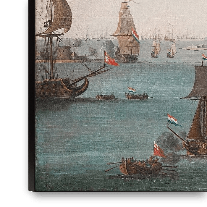 Signé W.V Stoop. Cette peinture de marine représente la bataille de Chatham en juin 1667, lorsque la flotte néerlandaise, sous le commandement de Michiel Adriaanszoon Reuter (1607-76), a remonté le fleuve Medway jusqu'à la base navale britannique de Chatham où elle a brûlé une grande partie de la flotte britannique. Le navire amiral britannique Royal Charles a été ramené à Amsterdam comme butin de guerre, où l'on peut encore voir ses contre-décorations au Rijksmuseum.
