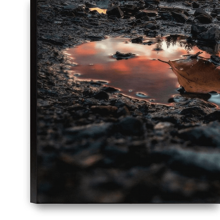 Le coucher de soleil se reflète dans la flaque d'eau.
