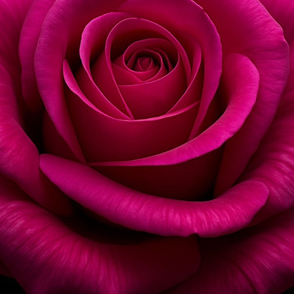 L'image montre une magnifique rose d'un rose profond sur un fond noir. La fleur est en pleine floraison, avec des pétales veloutés qui sont élégamment disposés et forment une symétrie parfaite. La couleur éclatante des pétales se détache fortement du fond sombre et souligne leur beauté naturelle. Les détails des fleurs sont nets et clairs, ce qui met particulièrement en valeur la fine texture des pétales.