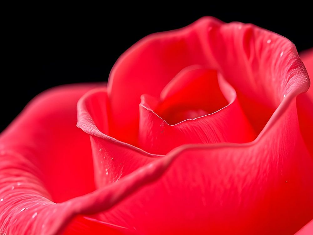 L'image montre une rose rouge sur un fond noir. Les pétales de la rose sont détaillés et vivants, avec des textures fines et une riche teinte rouge. La rose est en pleine floraison et les pétales incurvés lui confèrent une apparence élégante et gracieuse. Le contraste entre la rose rouge vif et le fond noir profond fait ressortir la fleur et souligne sa beauté naturelle.