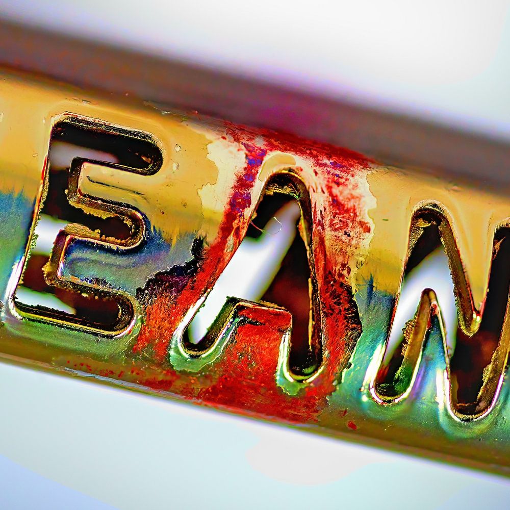 Image n° 32 de la série "Beauty of decay" : gros plan sur le mot "JEANS" découpé à l'emporte-pièce sur une boucle de ceinture métallique usée.