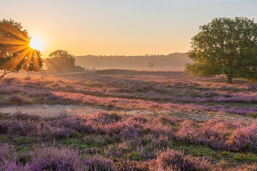 La bruyère près du Gooi est en fleurs, ce qui permet de réaliser de belles images au lever du soleil. Voici la Tafelbergheide près de Blaricum.