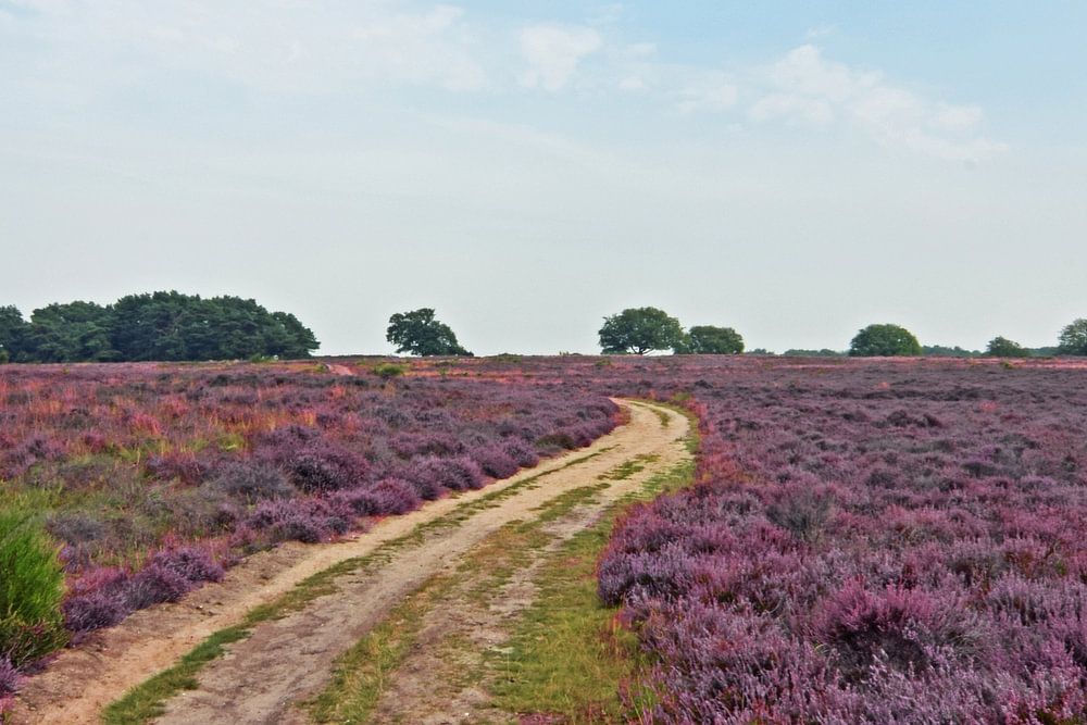 Le chemin de sable entre les bruyères fleuries disparaît à l'horizon. La bruyère pourpre ressort magnifiquement sous un ciel bleu légèrement couvert. Photo prise sur le Hoge Veluwe aux Pays-Bas