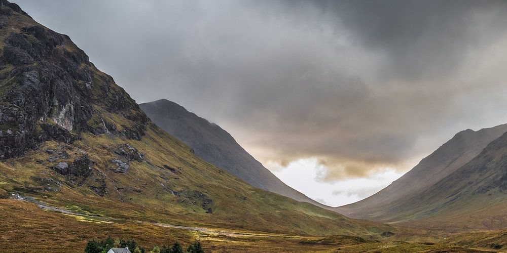 Le cottage de Lagangarbh à Glen Coe capte les derniers rayons du soleil d'automne. Glen Coe à la frontière de Rannoch Moor, district des Highlands, Écosse, Royaume-Uni.