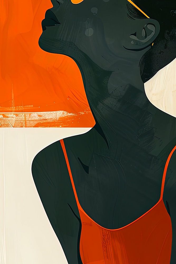 La femme, vêtue de tons orange chauds qui contrastent magnifiquement avec sa silhouette sombre, lève les yeux comme pour accueillir la lumière ou le soleil. Ses lunettes de soleil renforcent l'ambiance de modernité et de détente. L'arrière-plan est constitué d'un motif abstrait de couleurs orange et crème, avec des coups de pinceau fluides et des textures subtiles qui animent la composition. Une fine ligne noire abstraite sur la gauche ajoute un détail artistique, soulignant l'équilibre de l'œuvre.