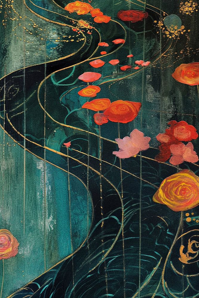 Inspirée par Flora, la déesse romaine des fleurs et du printemps, cette image représente un flux éthéré de fleurs dans l'obscurité de la nuit. Les fleurs semblent flotter et danser au rythme de la nature, guidées par des courants d'eau invisibles et des rafales de vent. Baignée dans une mer bleu nuit, enrichie de points dorés qui pourraient représenter les étoiles dans le ciel, cette œuvre donne vie à un monde magique où la nature chante ses propres mélodies tranquilles.