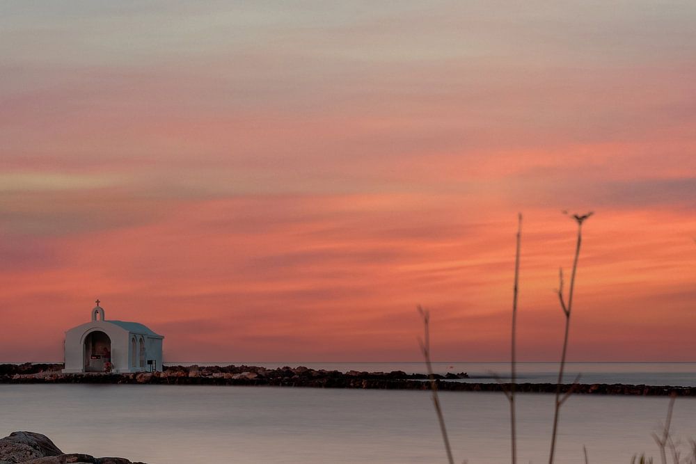 Achetez cette œuvre d'art de paysage La chapelle d'Agios Nikolaos au coucher du soleil par Christian Klös sur toile, aluminium, ArtFrame ou photographie (encadrée), impression d'art en haute qualité et tout format.