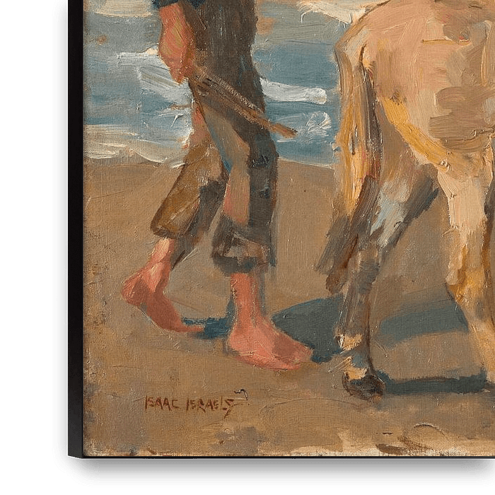 Isaac Israëls n'a jamais été peintre de marine, mais il emportait souvent son matériel de peinture et de dessin sur la plage. Plusieurs centaines de peintures à l'huile, d'aquarelles, de pastels et de dessins en témoignent. L'équitation sur l'âne est un sujet récurrent. Sur les quelque 100 huiles qu'Israëls a produites dans la station balnéaire de Scheveningen, environ 35 lui sont consacrées. Une photo d'Israëls au travail sur la plage montre qu'il a fait poser des enfants pour lui. Certaines de ces œuvres doivent donc montrer des personnes réelles, mais l'individualité des enfants n'est jamais mise en évidence. La photo présentée ici présente une forte ressemblance à la fois avec un tableau bien connu de la collection du Rijksmuseum et avec l'œuvre vue dans la célèbre photographie du studio d'Israël à Amsterdam. Bien qu'à première vue toutes les photos d'ânes se ressemblent beaucoup, un examen plus attentif montre qu'elles sont assez individuelles. Chacune a sa propre composition, car les Israëls ont varié le nombre d'ânes, la direction du mouvement, la position du soleil et d'autres détails de la scène.