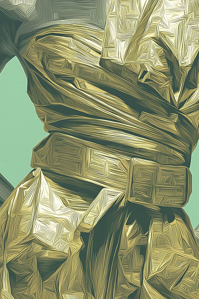 Une femme élégante vêtue d'une tenue dorée, brillante et plissée. Une posture forte, des lignes élégantes - la mode devient de l'art.