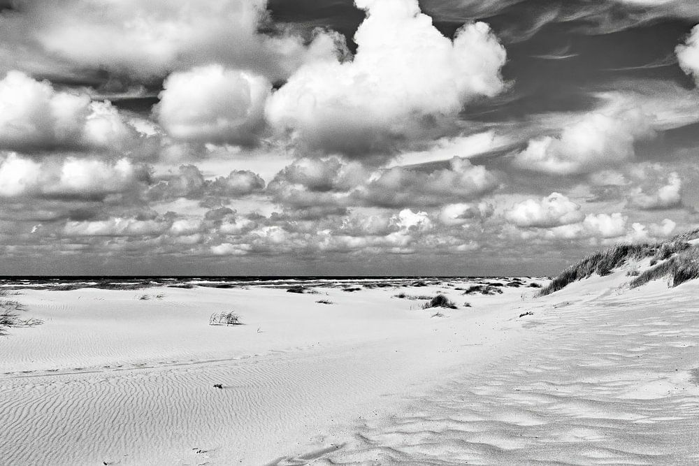 Une image en noir et blanc du littoral néerlandais avec son paysage de dunes et sa plage. À l'arrière de la photo, on peut également voir la mer du Nord. Structures de sable spéciales sur la plage de la mer du Nord.