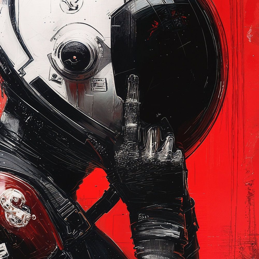 Lorsque je regarde "The Race is Over", je suis confronté à une scène poignante qui évoque à la fois le triomphe et l'épuisement. En son centre, une astronaute, vêtue d'une combinaison spatiale noire et élégante, se tient figée dans le temps, sur le point de se débarrasser du poids de son casque blanc. Le visage du pilote, caché jusqu'à présent, promet une histoire qui attend d'être découverte. Un emblème frappant en forme de double cercle sur l'épaule - rappelant les possibilités infinies - ajoute une allure nerveuse à cette figure contemplative.