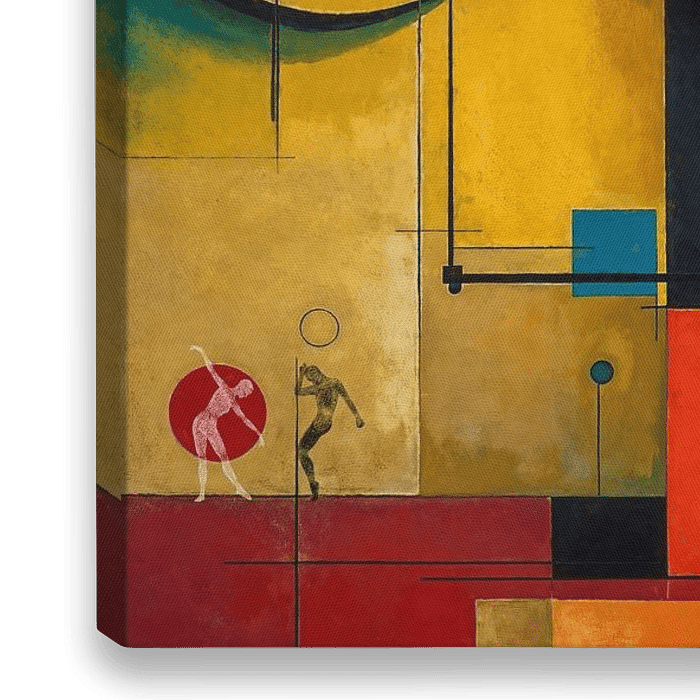 La géométrie, le rythme et la couleur s'unissent dans La danse de Kandinsky, une œuvre vibrante où l'abstraction rencontre l'expression humaine. Douze rendus 3D uniques de danseurs évoluent sur un fond dynamique généré par l'IA, peint numériquement dans des champs de couleurs vives et une composition graphique.