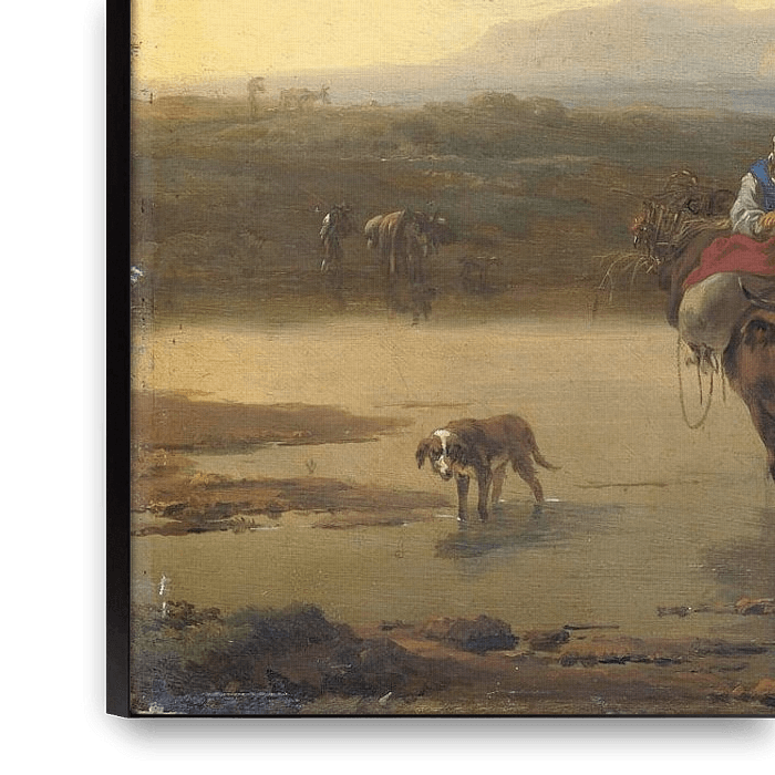 Un berger conduit son troupeau dans un endroit peu profond de la rivière. Les animaux turbulents laissent éclabousser l'eau, au grand dam de la femme d'un fermier qui patauge aussi dans l'eau. Une autre femme monte sur le dos d'un boeuf rempli de marchandises. Le caractère méridional du paysage a combiné Berchem avec les conifères, ce à quoi on peut s'attendre dans le nord.