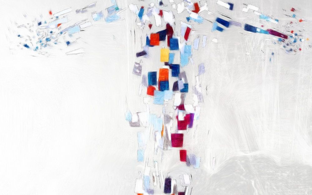 La destruction de l'humanité - peinture numérique abstraite à la gouache avec une figure féminine explosée sur un fond blanc et gris.