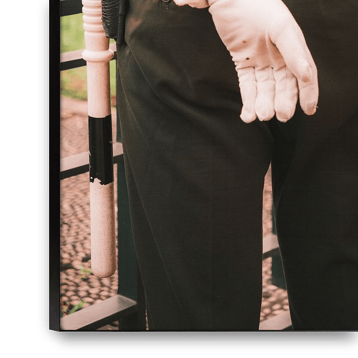Cette image puissante montre une vue détaillée d'un garde vietnamien qui se tient devant une clôture, vêtu d'un uniforme vert et de gants blancs. La pose, avec les mains croisées derrière le dos et l'équipement visible, évoque la maîtrise de soi, le contrôle et la signification symbolique de l'ordre public au Vietnam. Le brassard rouge à bordure dorée symbolise la responsabilité et la volonté de servir dans le contexte étatique, tandis que le tissu soigné de l'uniforme souligne le professionnalisme. En arrière-plan, la prairie verte et le motif structuré du sol se détachent, ce qui crée une scène calme, sérieuse et pourtant individuelle. Ce tableau s'adresse aux fans de street photography, d'uniformes, de rôle social et de culture asiatique. Il est idéal comme tableau mural pour les bureaux, les entrées ou les salles de travail et apporte un peu de discipline vietnamienne, de vie quotidienne et d'ordre directement et avec style dans chaque pièce.