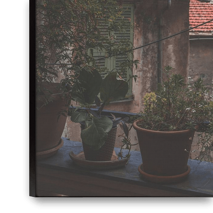 L'image est encadrée par les tons naturels de la toile de l'auvent et des pots de fleurs…
