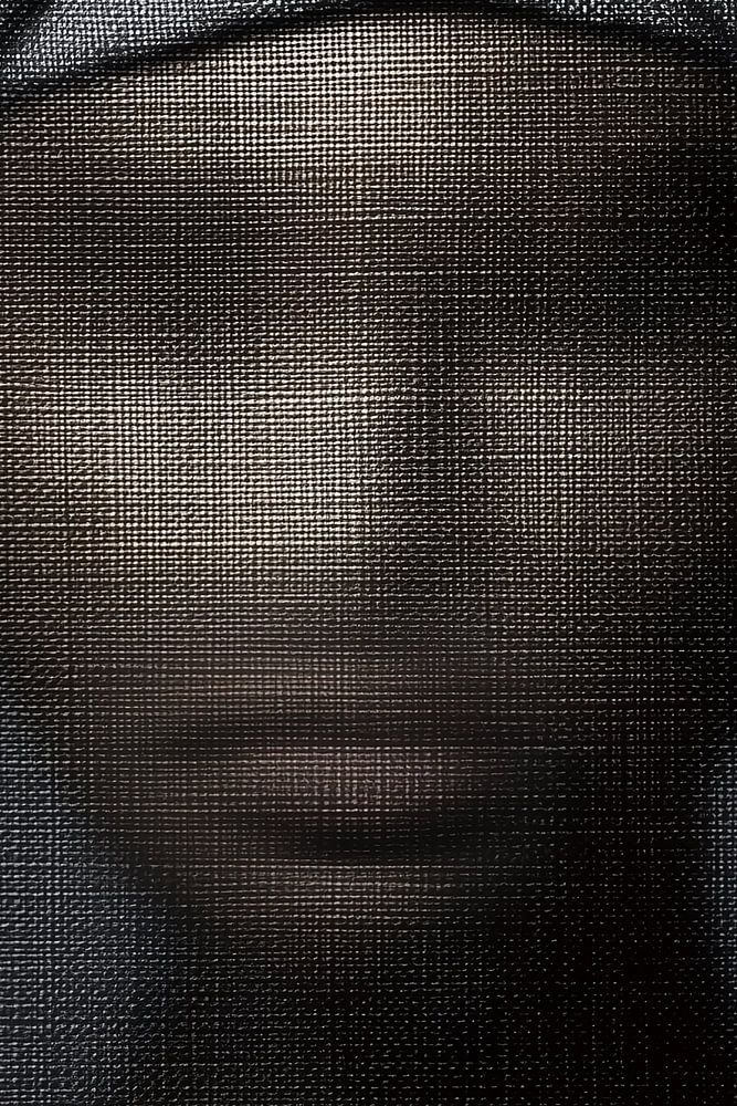 La structure textile est lourde et tactile, avec des couches distinctes et des irrégularités qui donnent à l'image profondeur et poids. Les nuances de gris et de brun dominent, renforçant le caractère terreux et austère. Les couleurs sont atténuées, comme adoucies par le temps et le toucher, ce qui contribue à l'atmosphère feutrée du portrait.