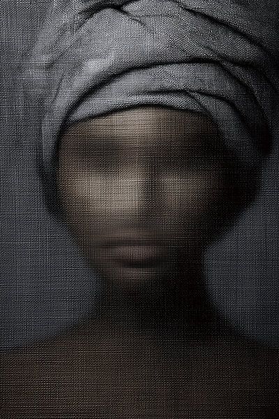 Son visage est partiellement visible, comme s'il émergeait lentement du tissu. Les contours des yeux, du nez et de la bouche sont doux et discrets, ils ne sont pas nettement dessinés mais palpables sous la texture du tissu. Ce flou l'éloigne d'une identité spécifique et rend le portrait universel. Il ne s'agit pas d'un instantané, mais d'un état d'être.