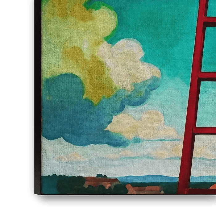 Dans ce tableau captivant, une femme se tient tout en haut d'une échelle imposante, tendant les bras vers les nuages, un bâton de mesure à la main. L'échelle elle-même est un élément frappant, son bois rustique et usé par les intempéries donnant une impression d'ancienneté et d'endurance. Elle s'étend à une hauteur improbable, défiant la gravité et la logique, ce qui renforce la nature surréaliste de sa tâche.