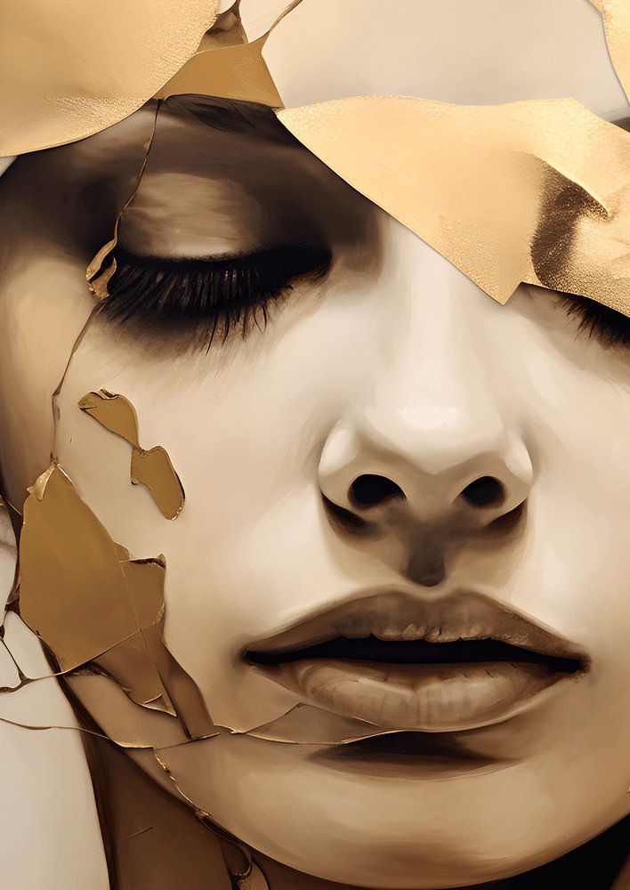 La fièvre de l'or est un portrait intrigant qui respire la féminité et la vulnérabilité, rehaussé par des accents dorés et des fractures fragmentaires. Le visage de la femme semble en partie couvert et en partie brisé, comme si la feuille d'or qui recouvre sa peau révélait des morceaux fragiles de son histoire. La combinaison de la douceur et de la force dégage une atmosphère sereine et mystérieuse, tandis que les tons dorés ajoutent chaleur et élégance. Cette œuvre invite le spectateur à contempler la beauté, l'imperfection et les couches qui composent une identité.