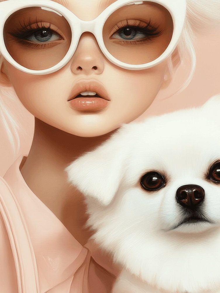 Dans cette œuvre d'art, nous voyons une fille élégante, avec de grosses lunettes et un regard qui dit : "Je suis prête pour un défilé de mode... ou une promenade dans le parc."À ses côtés se trouve son ami à quatre pattes élégant, qui semble apprécier les accessoires autant que sa maîtresse. Ensemble, ils forment le couple de choc par excellence, prêt à conquérir les cœurs et à lancer la mode. Une subtile touche d'humour se dégage de la combinaison de leurs regards sereins et de leur style parfait - comme si c'était la chose la plus normale au monde pour eux !