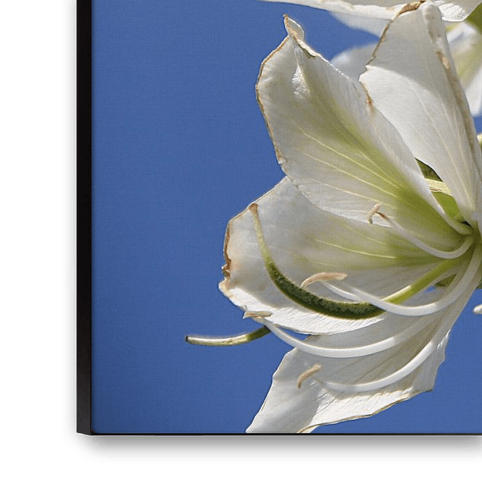 Photo d'une fleur blanche contrastant avec le ciel bleu. Cette photo est idéale pour un poster de jardin(s).