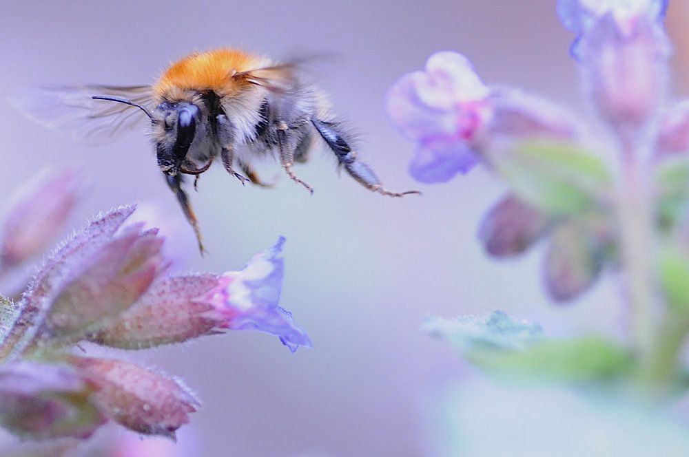 ... la petite histoire que nous connaissons tous. La fleur et l'abeille. Dans ce cas, il s'agit d'une vraie abeille et de vraies fleurs. L'abeille a été photographiée en plein vol alors qu'elle cherchait du nectar. Ces animaux sont des travailleurs assidus et ne perdent pas une seconde pour rendre visite à toutes les fleurs. Cette prise de vue peut également être livrée en format panoramique.