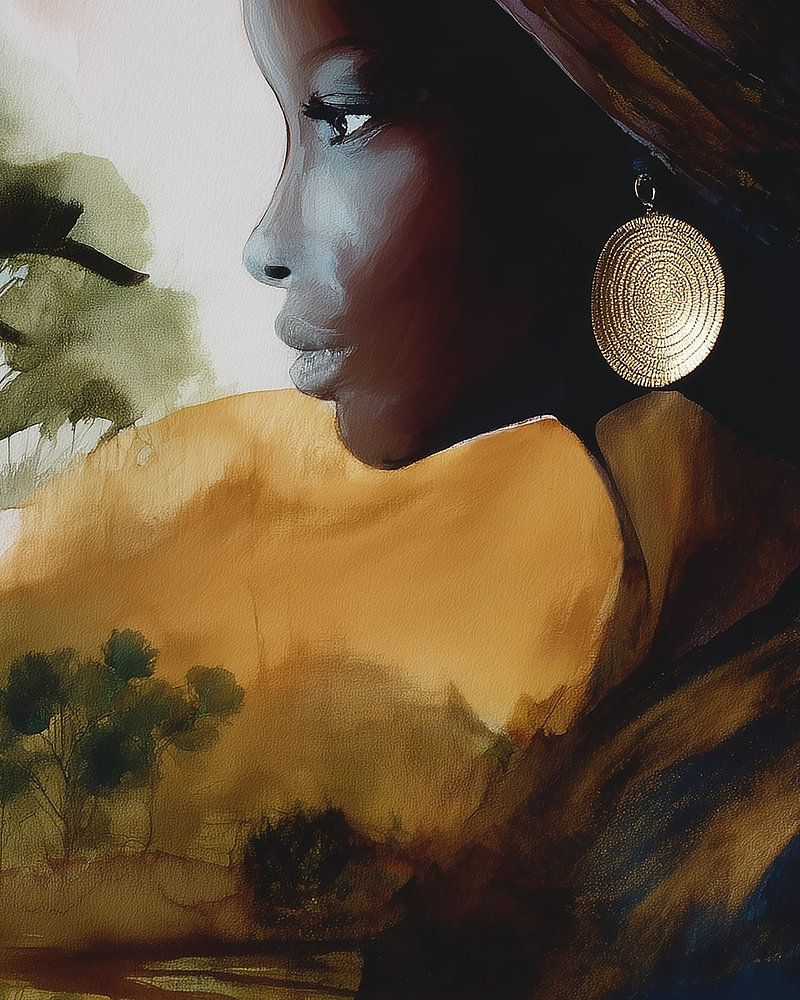 Le bijou en or à son oreille agit comme une ancre : un symbole de valeur, de tradition et d'intemporalité. Il capte la lumière et souligne que sa force ne crie pas, mais brille. Strength in Profile est une ode à la détermination tranquille, aux femmes qui portent, préservent et poursuivent - la tête haute, même lorsqu'elles ne regardent pas droit devant elles. Abstrait moderne. Acacia. Afrique.
