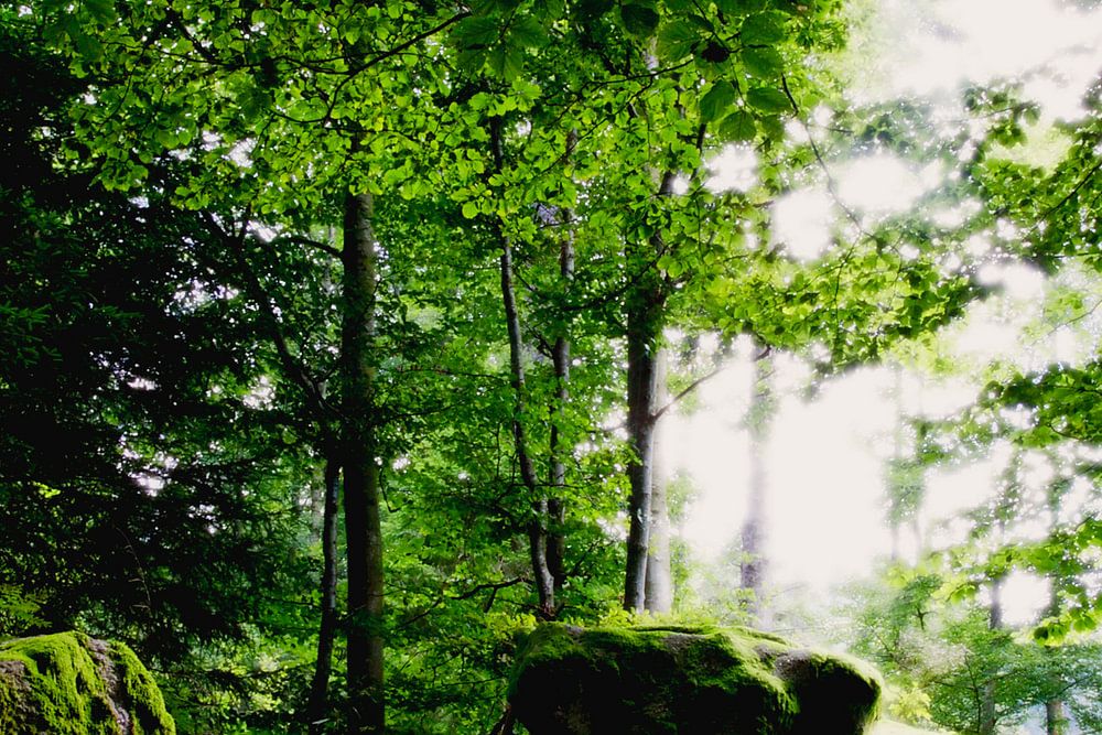 Forêt éclairée près d'Elzach dans la Forêt-Noire, Bade-Wurtemberg, Allemagne