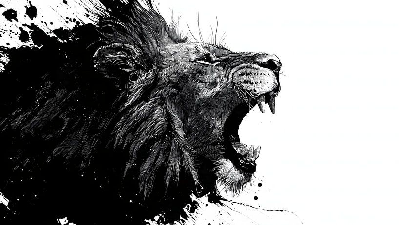 Le rugissement du lion est figé, dépouillé de son son et de son contexte. Sa gueule ouverte devient une cavité visuelle plutôt qu'un acte de domination. La crinière se dissout dans une encre chaotique, suggérant un appétit non seulement pour la survie, mais aussi pour le sens, la validation et la reconnaissance. L'absence de proie…