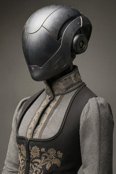L'habillage textile contraste avec cela. Le tissu à taille haute, à la structure fine et aux broderies discrètes, rappelle les vêtements traditionnels sans les situer concrètement. Les matériaux semblent lourds, durables et soigneusement travaillés. Le drapé sombre se pose tranquillement sur le corps et renforce la posture droite du personnage. Le textile et le métal se rencontrent à hauteur des yeux.