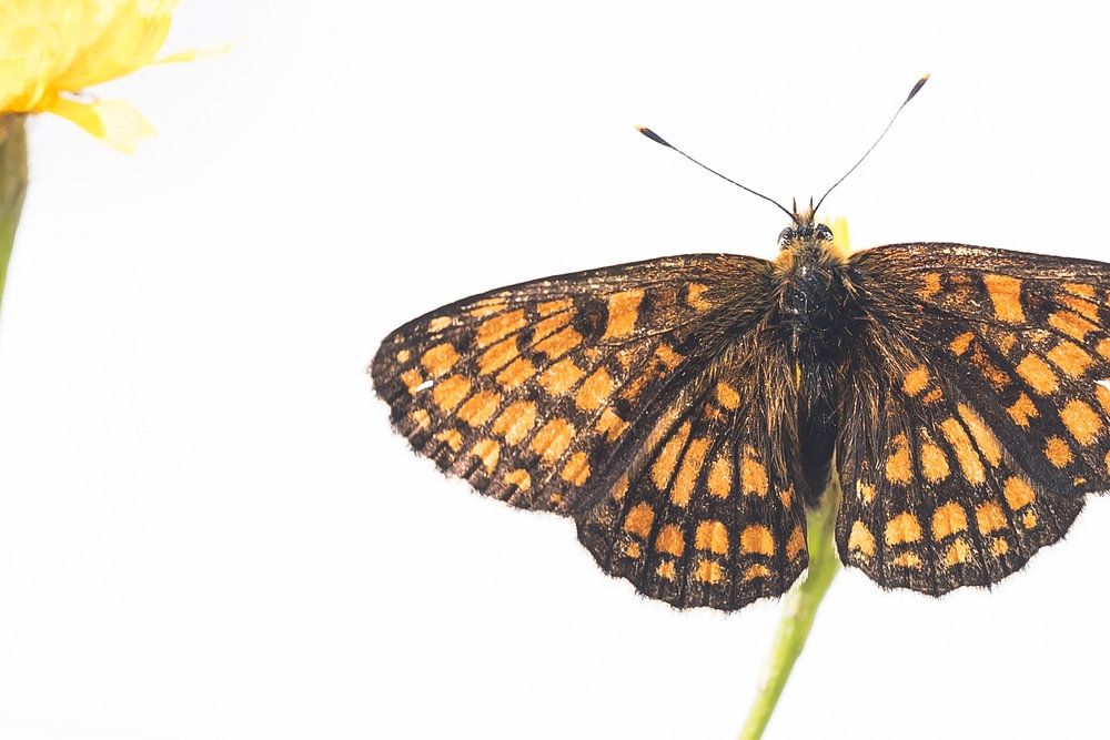 Cette fritillaire des bois s'est bien assise. La composition n'aurait pas pu être meilleure. Cette photo a été prise à partir d'un point d'observation bas, à cause de ce fond blanc. C'est une image graphiquement fine, simple et colorée.