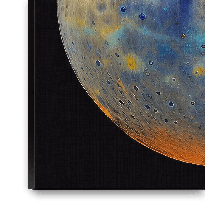 Cette œuvre d'art captivante montre un corps céleste vivant, représenté dans un mélange fascinant de tons bleus, oranges et jaunes. Des textures semblables à des cratères et des transitions de couleurs continues créent un effet dynamique d'outre-tombe. Sur un fond profond et sombre, la sphère lumineuse évoque les mystères et la beauté…
