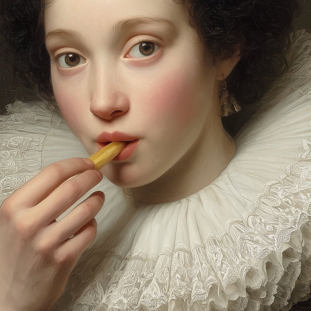 Une jeune femme, vêtue d'un magnifique col en dentelle comme si elle sortait tout droit du XVIIe siècle, regarde rêveusement le monde tout en mangeant tranquillement une frite. L'élégance raffinée d'un portrait de maître rencontre le plaisir simple de la restauration rapide.