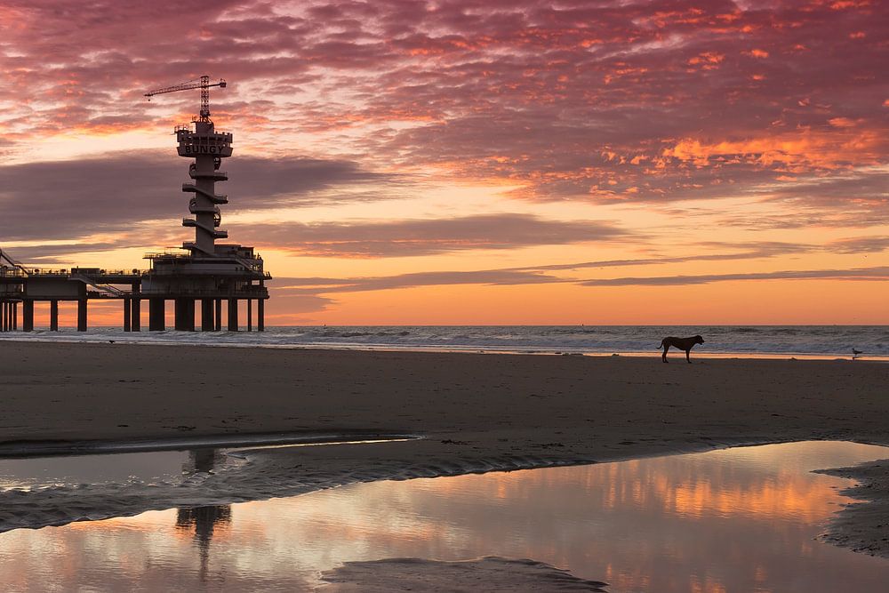 La jetée et la grande roue de Scheveningen et la silhouette d'un homme et de son chien au coucher du soleil sur le Noorderstrand à La Haye, aux Pays-Bas.