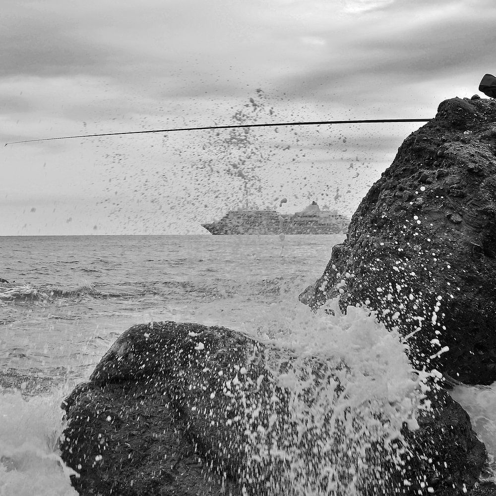 Ce paysage maritime, avec des pêcheurs à la ligne, un voilier et un énorme paquebot en arrière-plan, a été pris le 24 octobre 2024 en fin d'après-midi, directement sur la côte maritime de Giardini Naxos, située sur la côte est très prisée de la Sicile, dans le sud de l'Italie.
