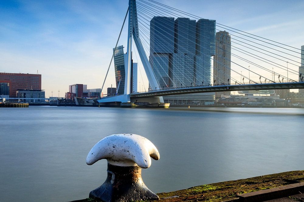 La ligne d'horizon de Rotterdam le long de la Meuse, avec le caractéristique pont Erasmus et l'architecture moderne du Kop van Zuid.