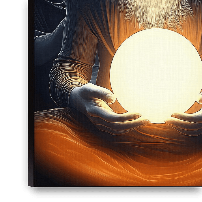 Une vision au-delà du temps - Ce chef-d'œuvre numérique éthéré montre un ancien sage de l'au-delà tenant une sphère lumineuse dans sa main et rayonnant la sagesse cosmique. Flanquée de figures ombrageuses, la scène symbolise le savoir, le destin et les forces invisibles qui guident l'existence.