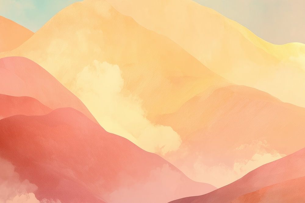 Avec des teintes de rose tendre, de sable, de bleu brumeux et de jaune doré, l'œuvre évoque un sentiment de calme et d'émerveillement. La lumière semble briller entre les lignes, donnant de la profondeur aux formes montagneuses sans jamais devenir gênante. L'atmosphère est légère et aérienne, comme si l'on regardait un horizon lointain sous la douce lumière d'un soleil levant.