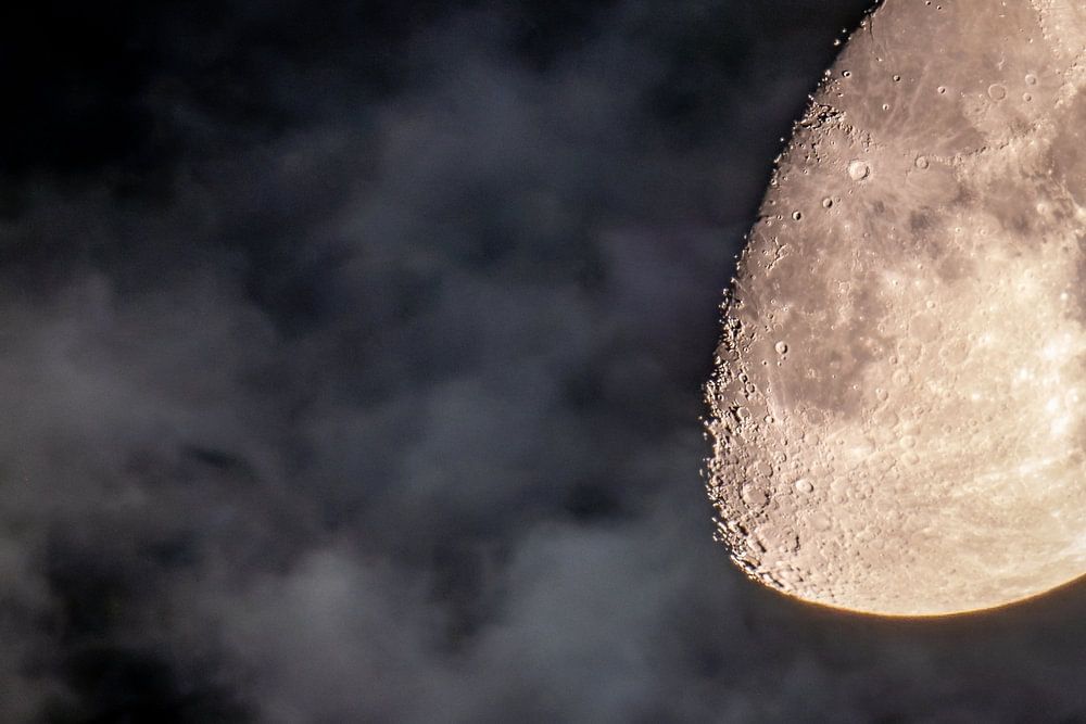Photo prise une semaine avant la pleine lune de sang. La lumière orange de la lune colore les nuages qui passent.
