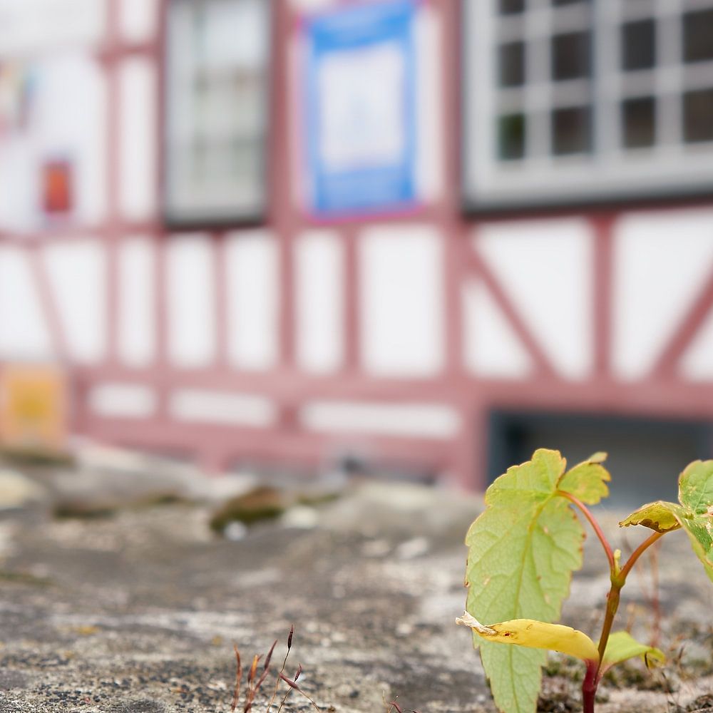 Lutte pour la survie du jeune plant d'un érable dans un mur historique de la vieille ville de Schmalkalden dans la forêt de Thuringe en Allemagne. En arrière-plan, une maison historique à colombages dans la vieille ville.